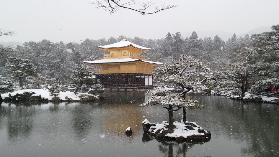 A Kyoto il y a non pas une, mais deux photos à prendre : un temple au moment de la floraison des cerisiers, et le Pavillon d’or sous la neige.