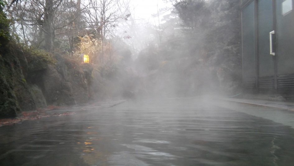 Onsen aren’t just public baths, they are more like spas: the water comes from the insides of the earth, your nose is prickling, the smell of sulphur is so strong. You have read somewhere that Onsen were good for something. You don’t remember quite well, but you are enjoying sitting in this large communal bath, in very hot water. And outside.